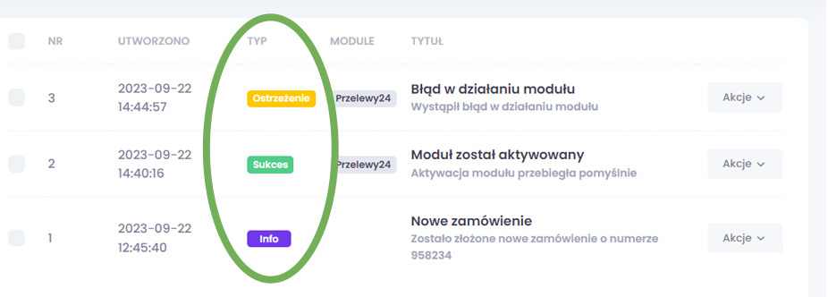 W kolumnie "Typ" tabeli logów znajdziesz informacje dotyczące rodzaju poszczególnych wpisów. Każdy log jest przypisany do jednej z trzech kategorii: