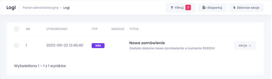 Proces usuwania logów opisany powyżej ma analogiczną zastosowanie w przypadku wszelkich innych rekordów w bazie danych platformy. Zawsze, gdy spotkasz tabelkę zawierającą dane, zauważysz obecność przycisku "Akcje". Pamiętaj, że kliknięcie tego przycisku otworzy menu kontekstowe, które umożliwi różnorodne działania związane z danym wpisem w tabelce. To dotyczy nie tylko logów, ale również innych rodzajów danych w systemie.
