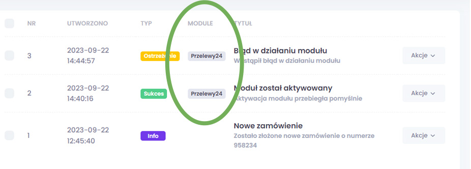 W przypadku, gdy dany log jest powiązany z konkretnym modułem, kolumna "Moduł" wskazuje nazwę modułu, którego dotyczy dany wpis. Na przykład, jeśli logowanie dotyczy modułu o nazwie "Przelewy24", wówczas w tej kolumnie pojawi się nazwa "Przelewy24". Dzięki temu łatwo można zidentyfikować, do którego modułu odnosi się dany log.