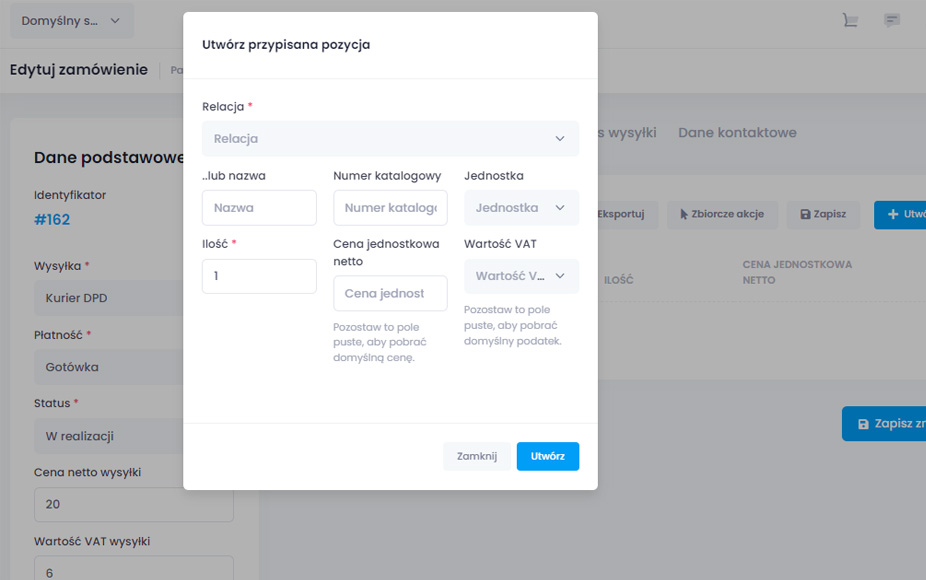 Po naciśnięciu przycisku "Utwórz", pojawi się formularz, który umożliwia dodanie pozycji do zamówienia. Znajdziesz tu dwie opcje do wyboru: