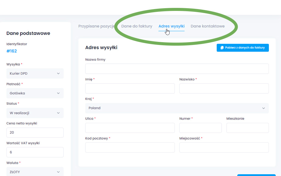 Aby wzbogacić i spersonalizować tworzone zamówienie o istotne szczegóły dotyczące wysyłki oraz danych odbiorcy, należy przejść przez trzy kluczowe zakładki: "Dane do faktury", "Adres wysyłki" oraz "Dane kontaktowe".