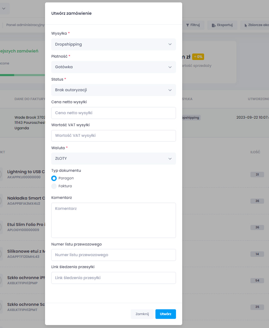 Po wypełnieniu formularza, kliknij przycisk "Utwórz", co spowoduje przekierowanie na stronę edycji zamówienia. Tutaj będziesz miał możliwość dodania przypisanych pozycji (produktów), uzupełnienia danych do faktury, podania adresu dostawy oraz danych kontaktowych. Pola nieoznaczone gwiazdką, takie jak "komentarz", "numer listu przewozowego" czy "link śledzenia przesyłki", są opcjonalne i mogą zostać wypełnione w późniejszym czasie.